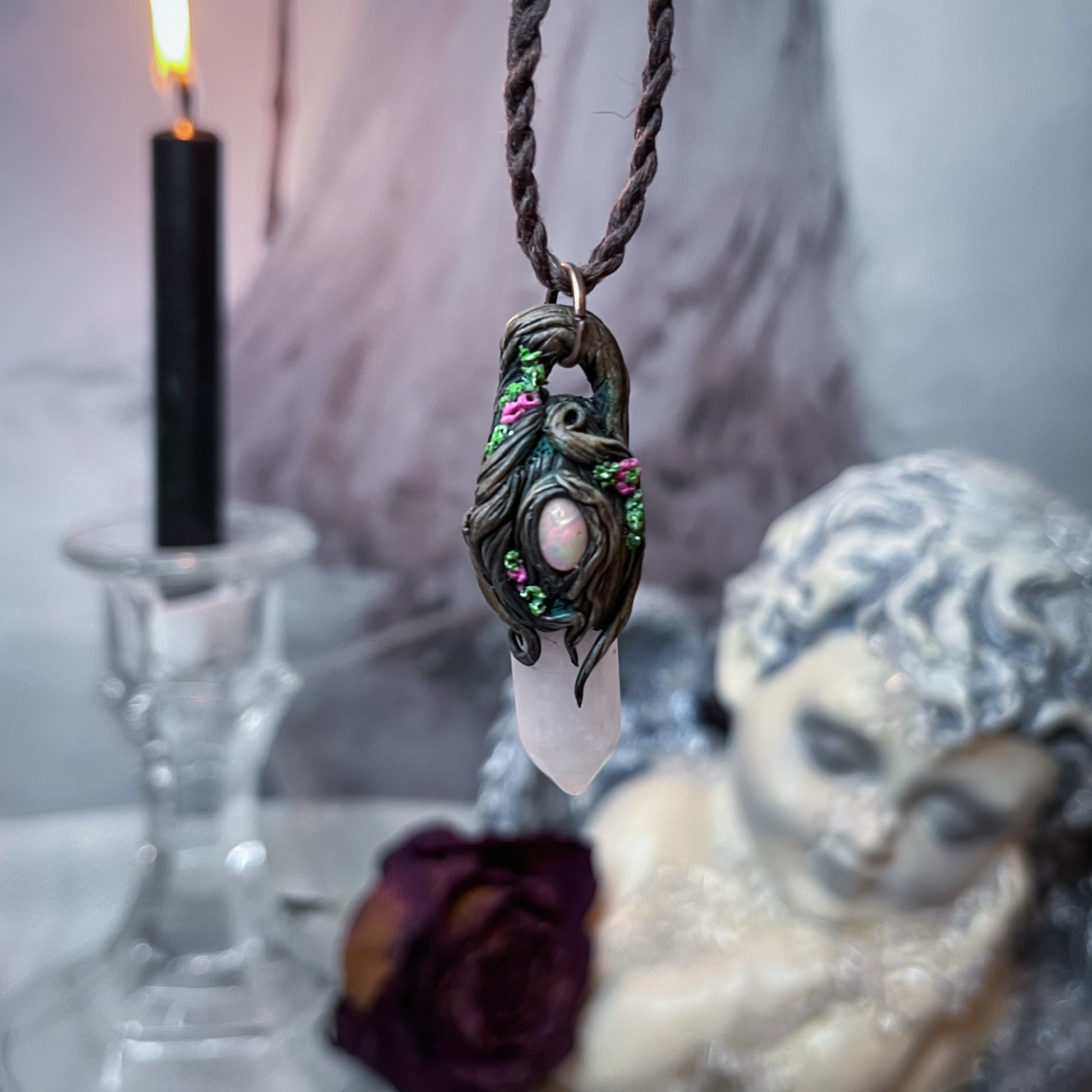 Rose quartz & Opal floral forest pendant